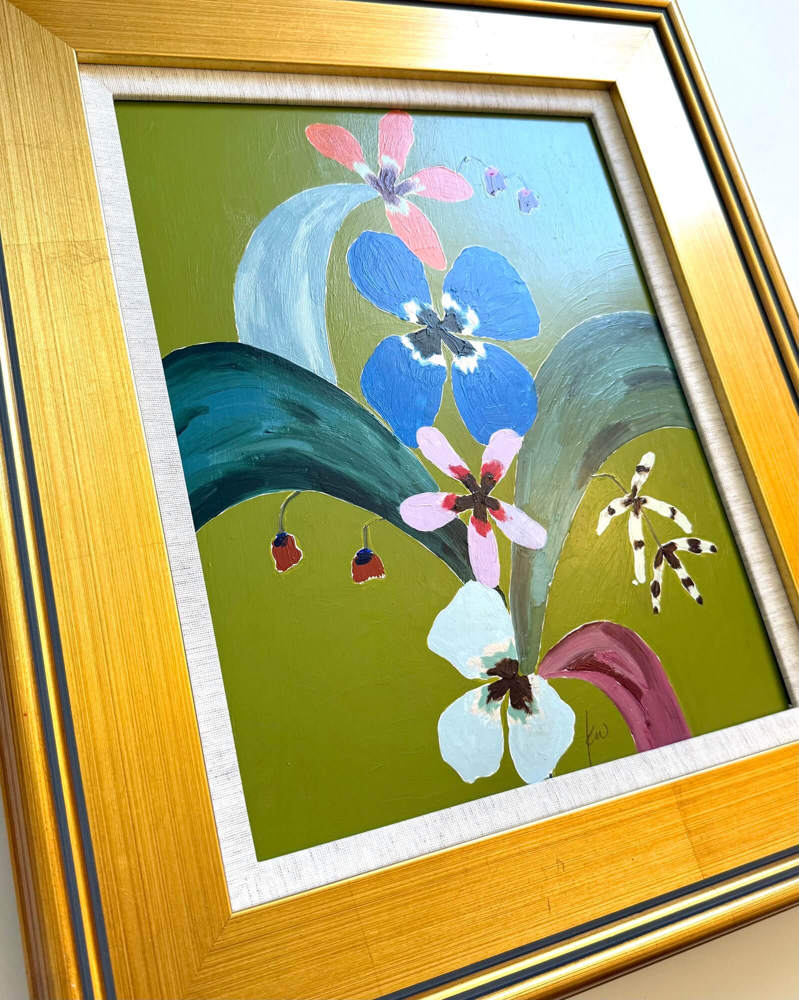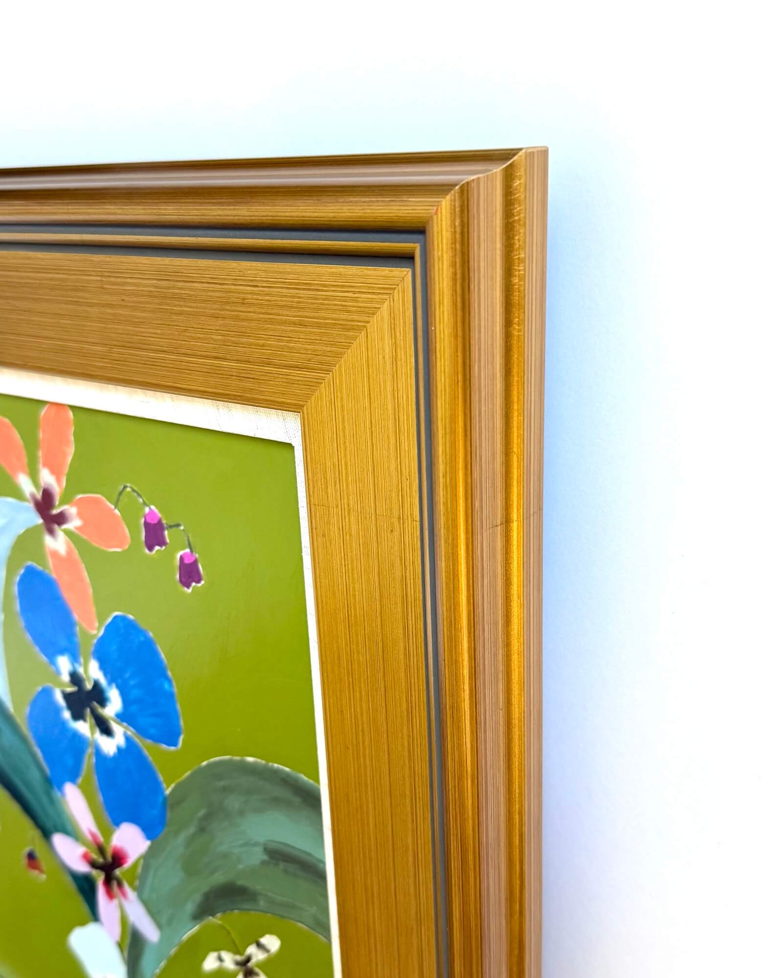 Original acrylic painting on panel, framed in vintage inspired gold.