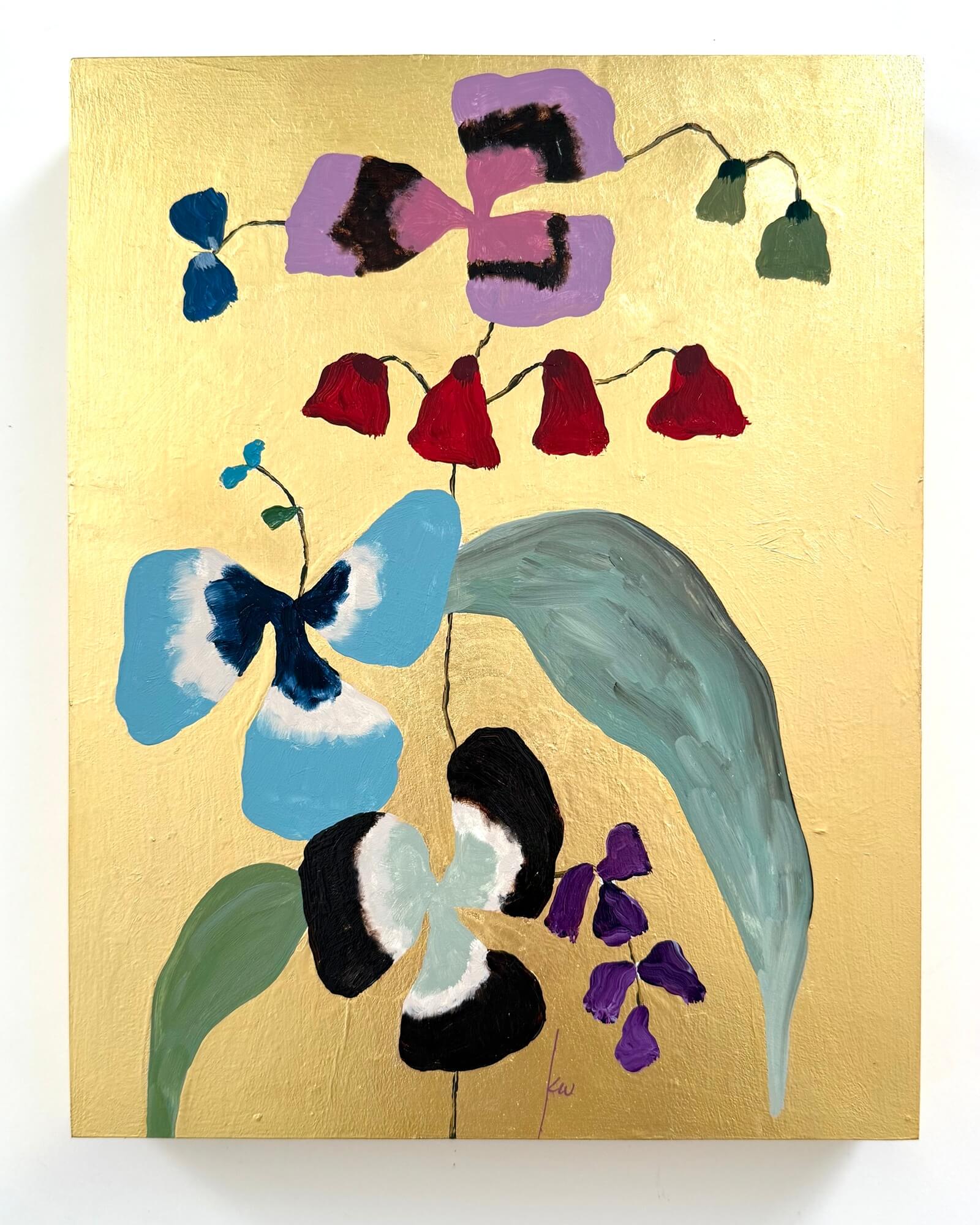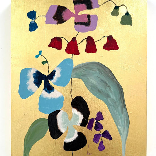 Painting is varnished on the sides and flowers to protect against dust and UV light. The 23k gold leaf on the front is unvarnished to maintain the glow and velvety appearance of the gold leaf.