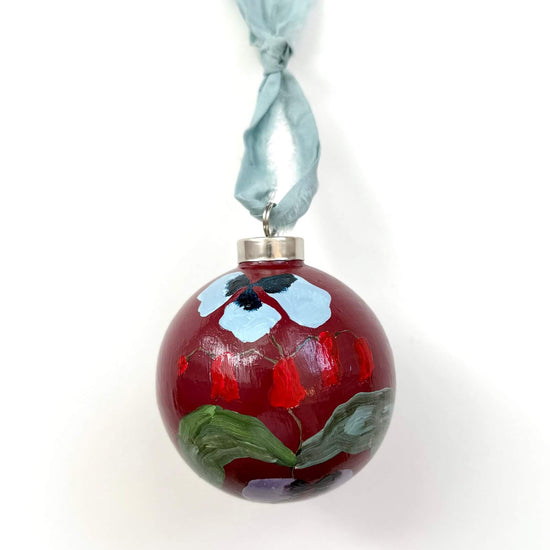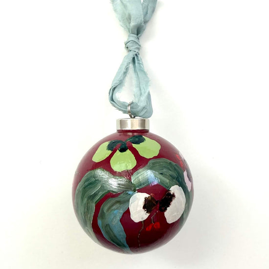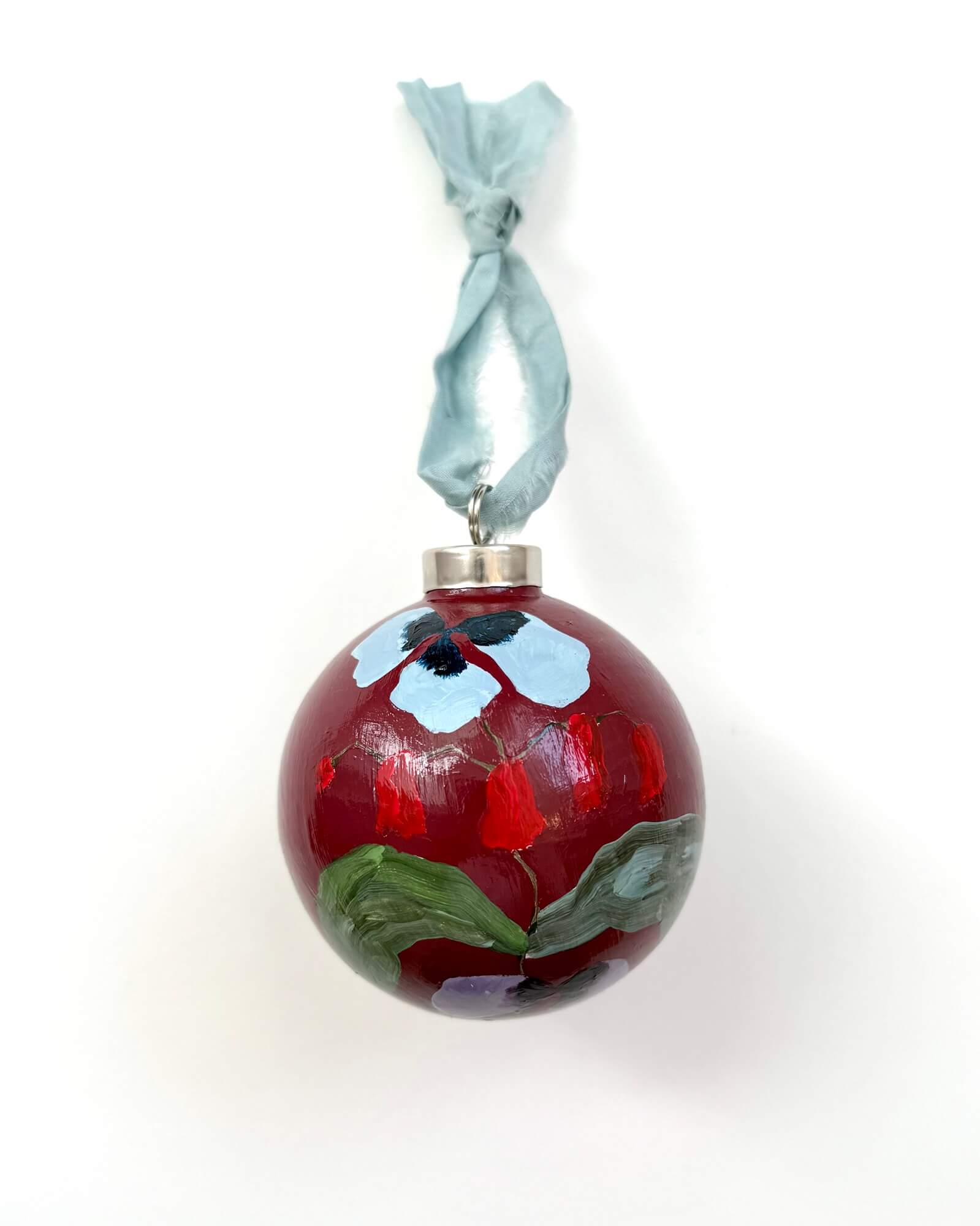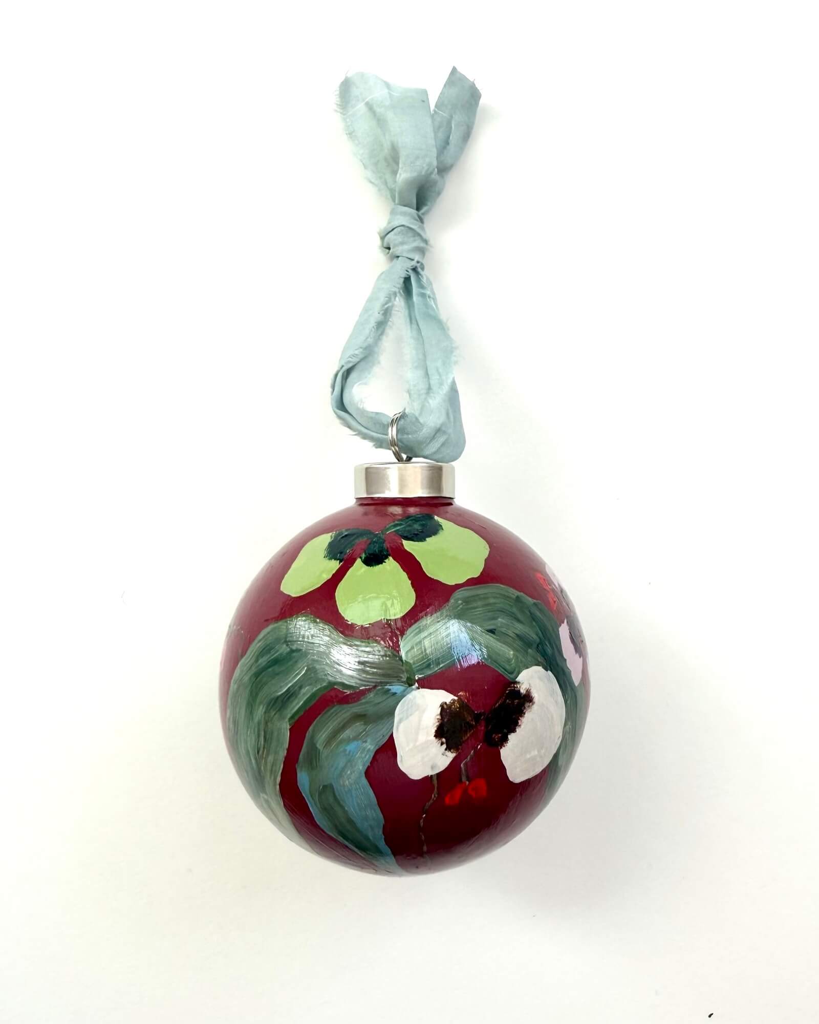 Each ornament is signed and dated on the bottom, and finished with a glossy varnish and raw edge silk ribbon.