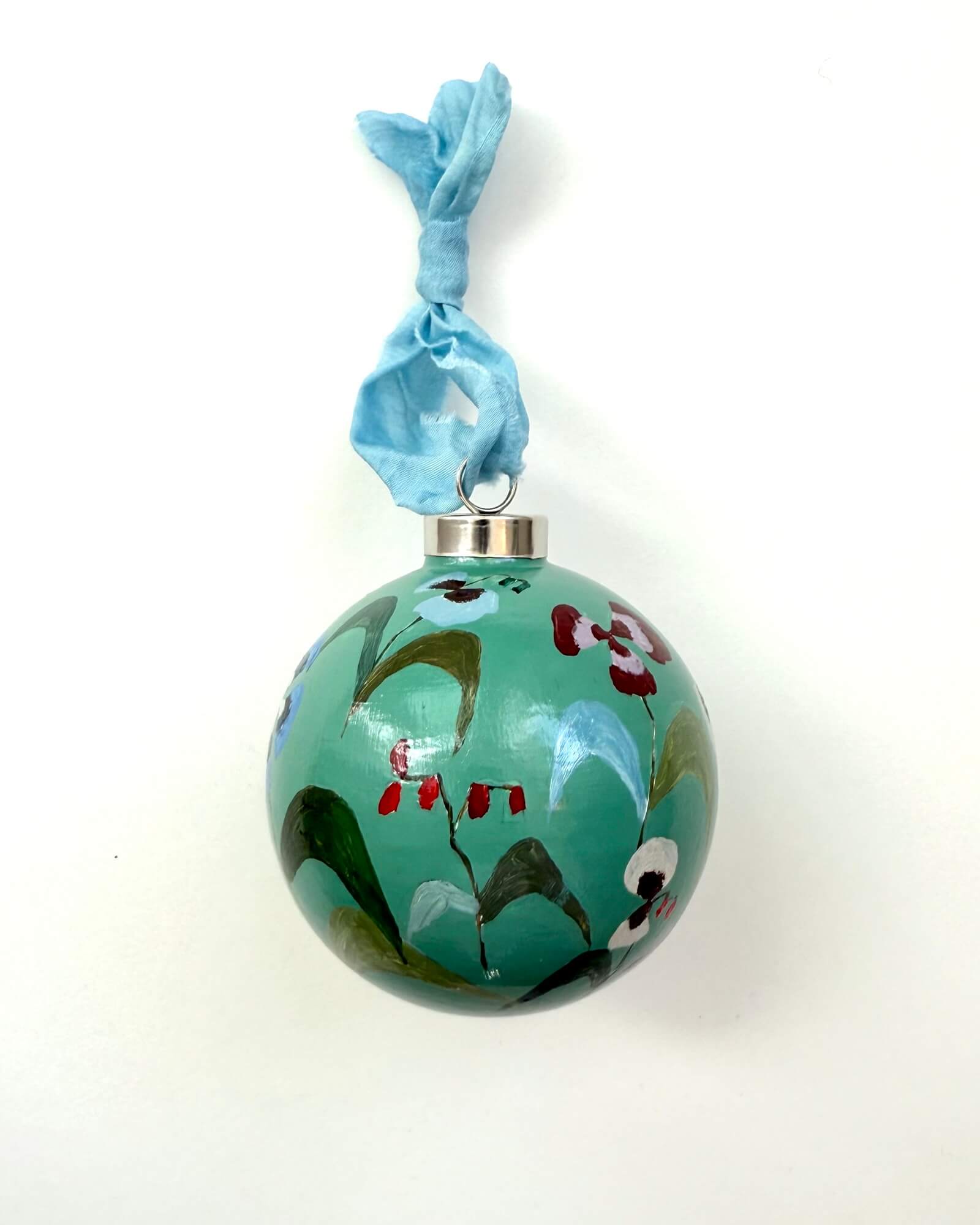 Each ornament is signed and dated on the bottom, and finished with a glossy varnish and raw edge silk ribbon.