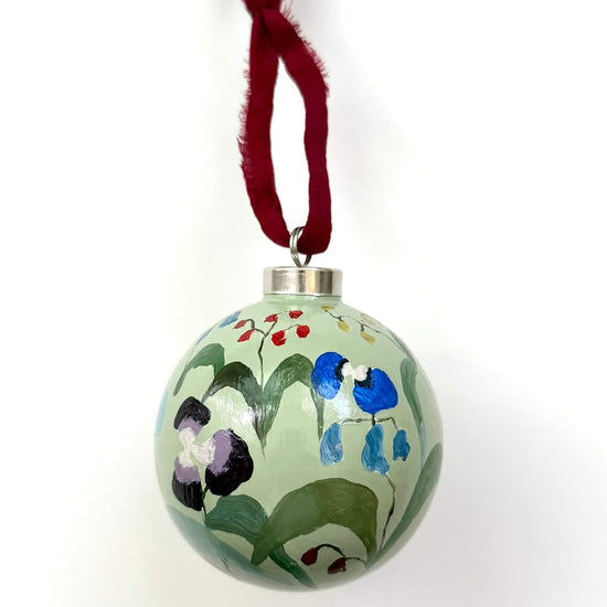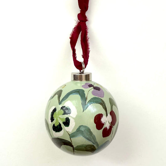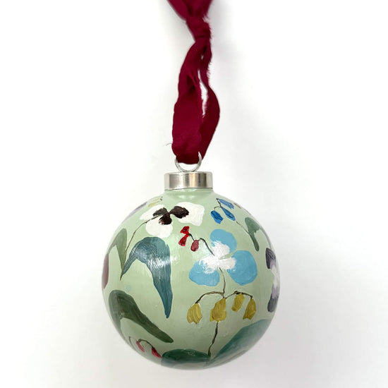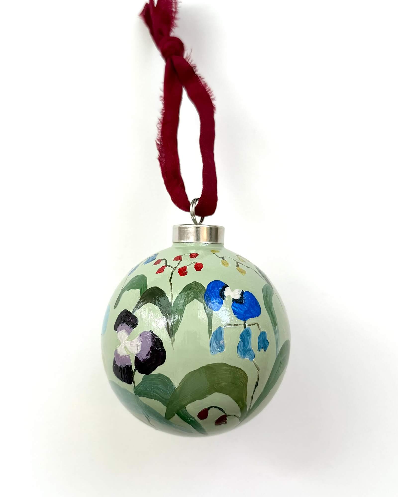 Each ornament is signed and dated on the bottom, and finished with a glossy varnish and raw edge silk ribbon.
