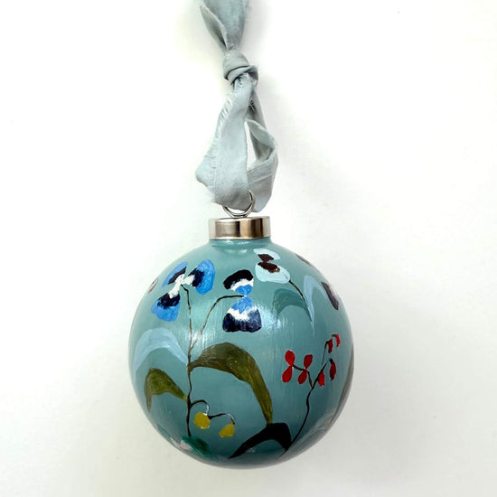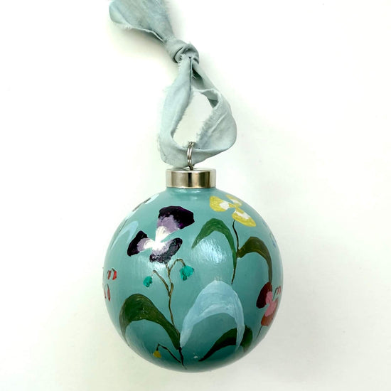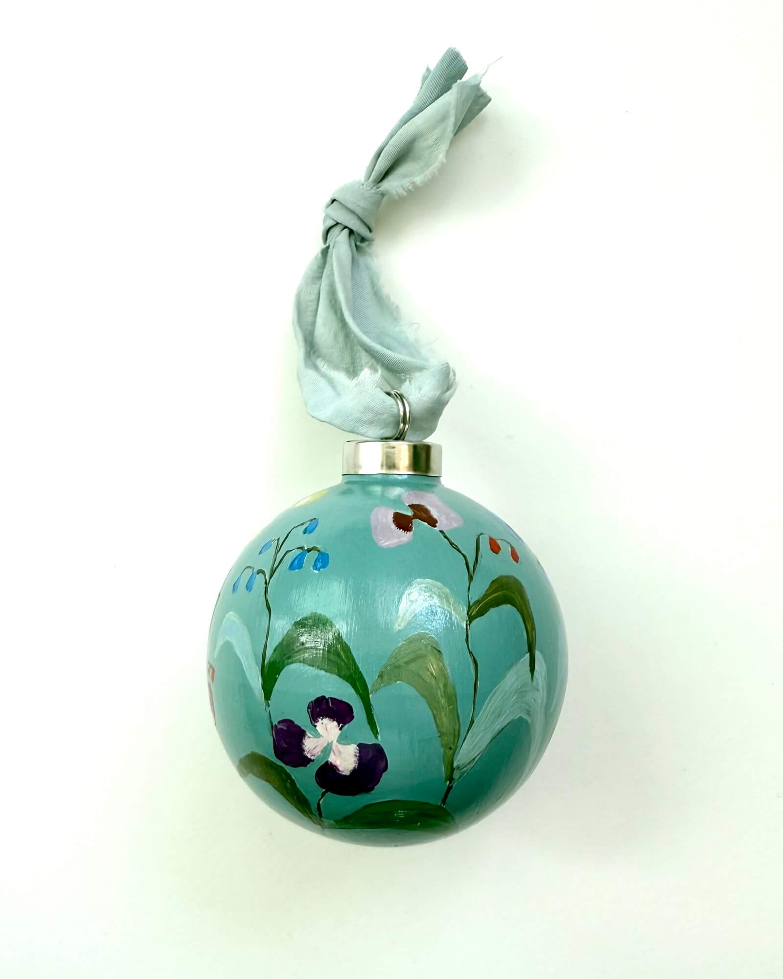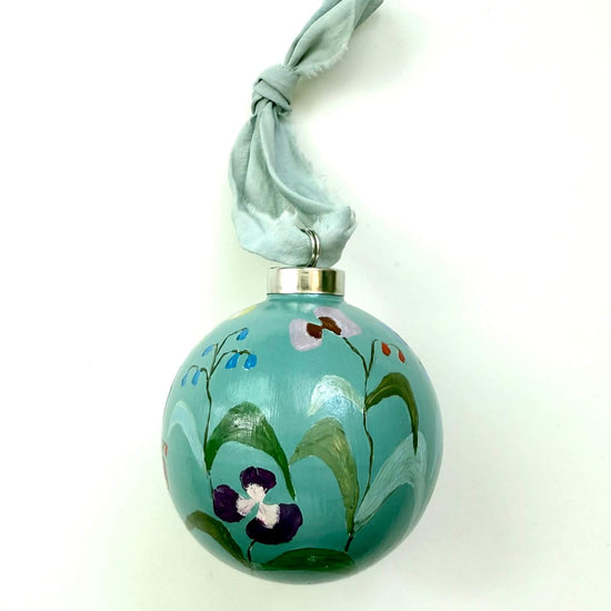 Each ornament is signed and dated on the bottom, and finished with a glossy varnish and raw edge silk ribbon.