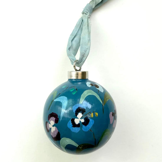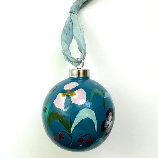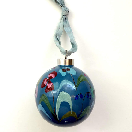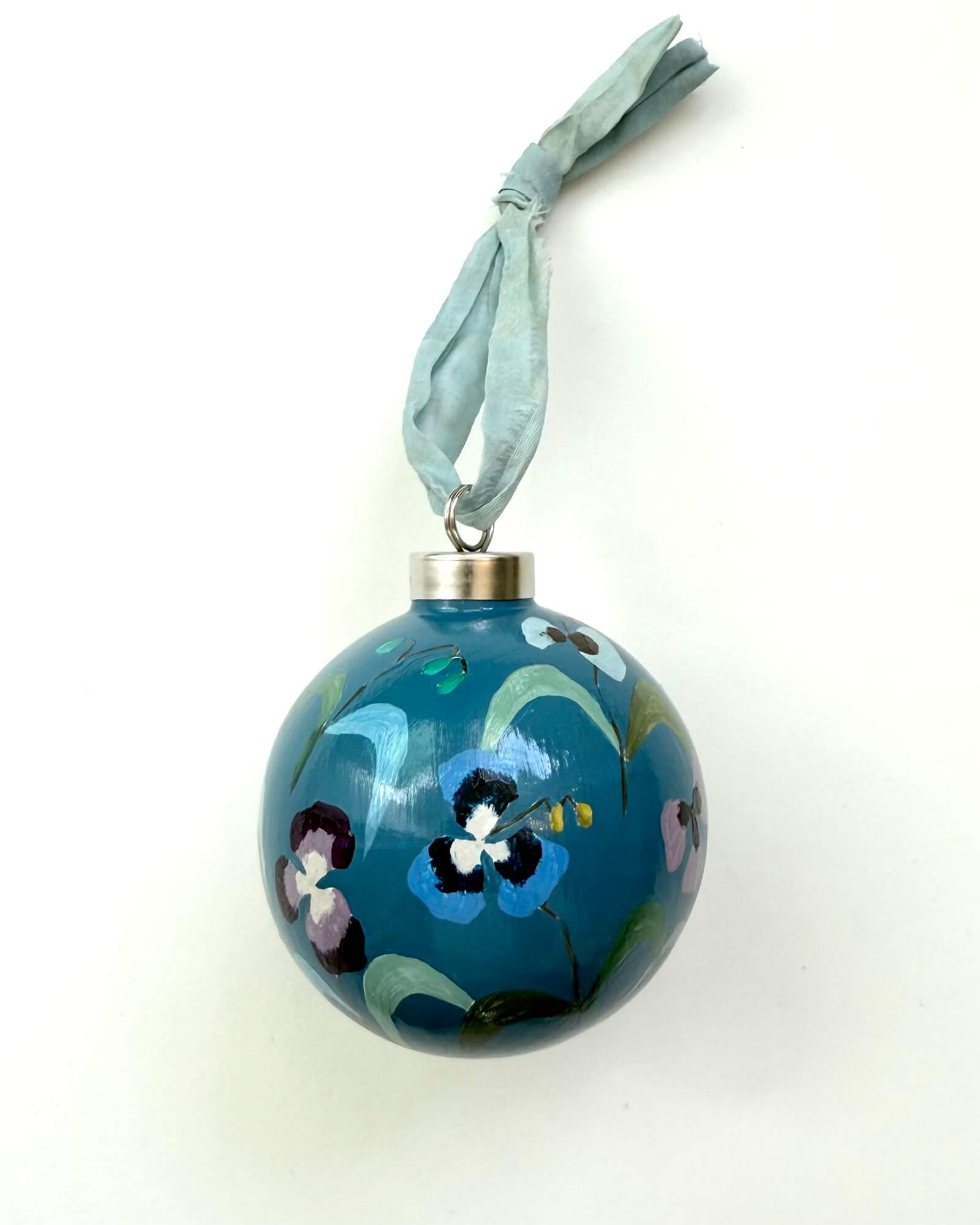 Each ornament is signed and dated on the bottom, and finished with a glossy varnish and raw edge silk ribbon.