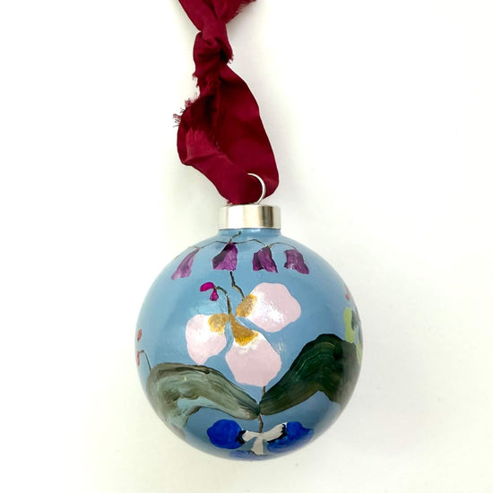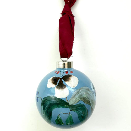 Each ornament is signed and dated on the bottom, and finished with a glossy varnish and raw edge silk ribbon.