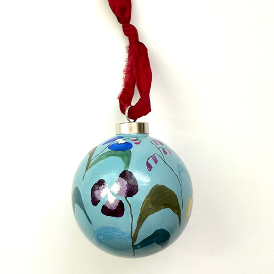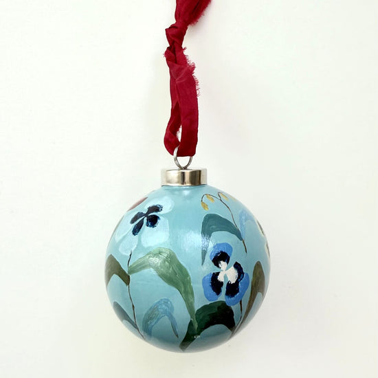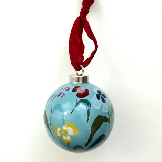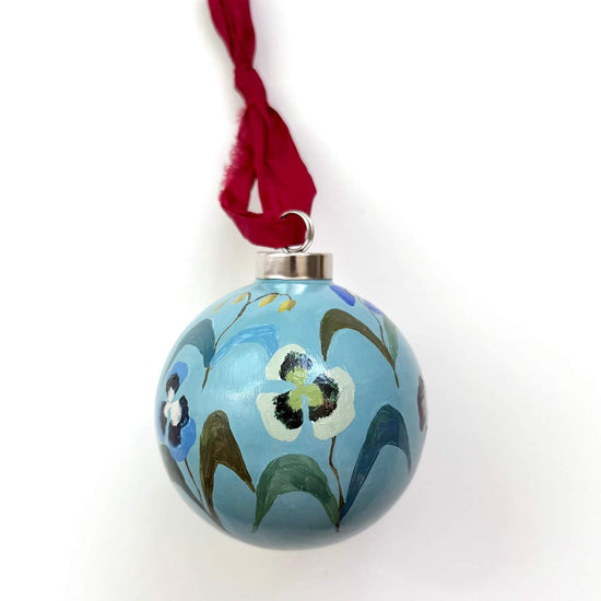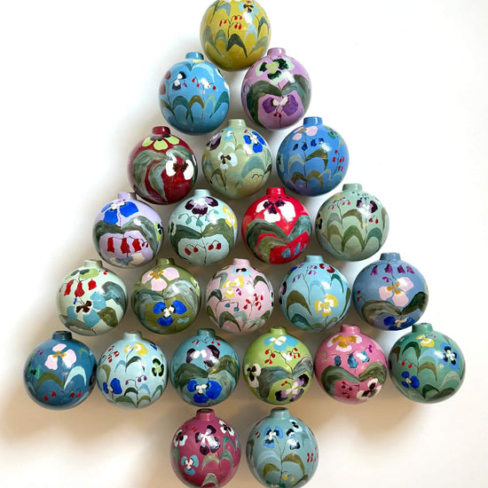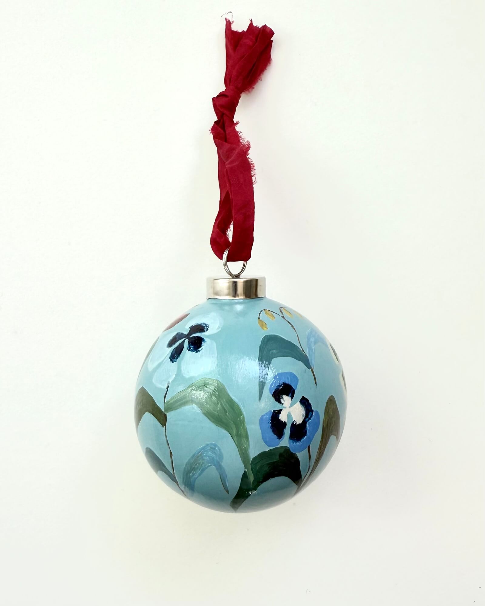 Each ornament is signed and dated on the bottom, and finished with a glossy varnish and raw edge silk ribbon.