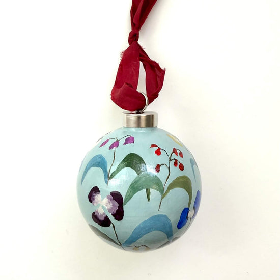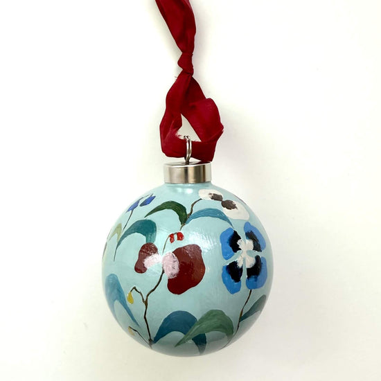 Each ornament is signed and dated on the bottom, and finished with a glossy varnish and raw edge silk ribbon.