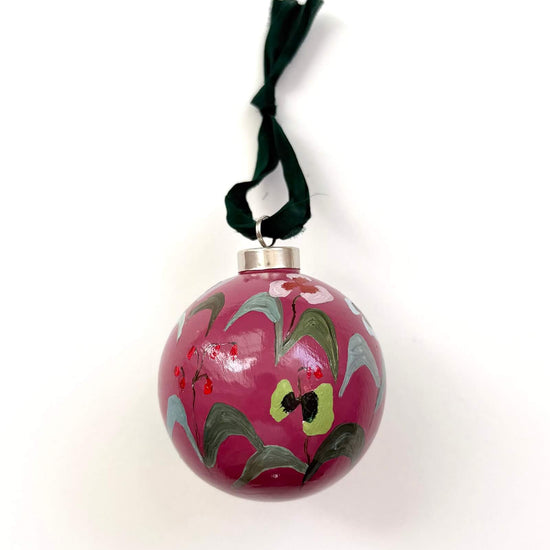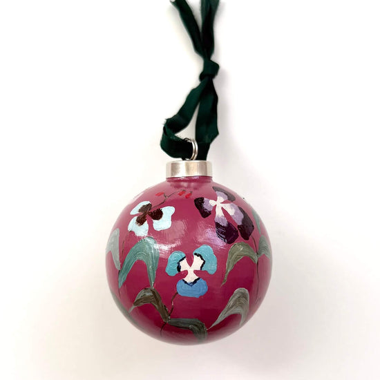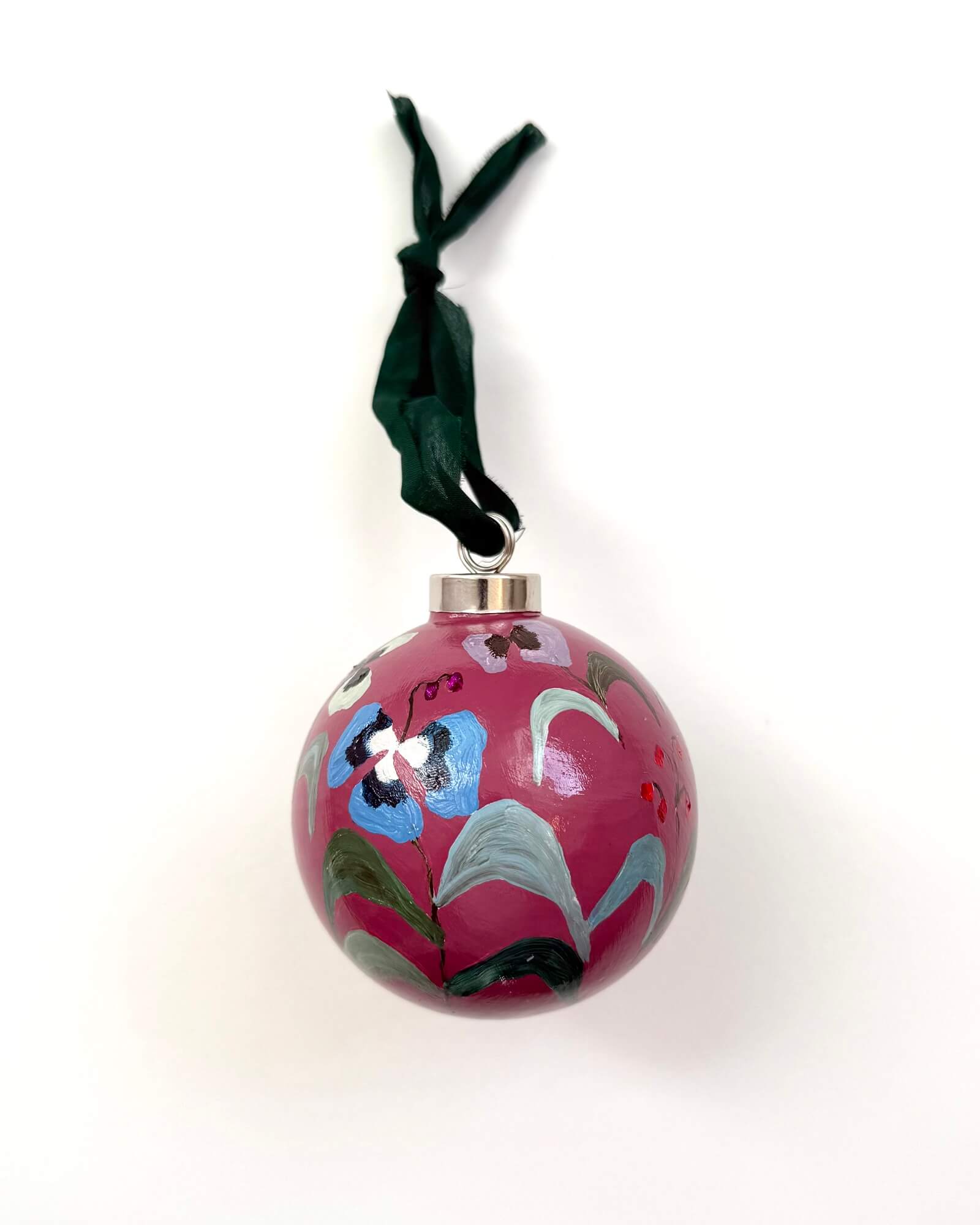 Each ornament is signed and dated on the bottom, and finished with a glossy varnish and raw edge silk ribbon.