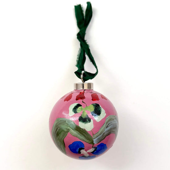 Each ornament is signed and dated on the bottom, and finished with a glossy varnish and raw edge silk ribbon.